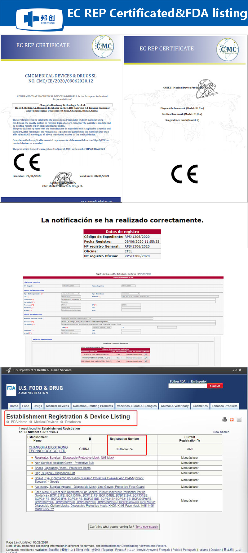FDA Registered. Registered Number:3016794574 Test Report with Standard EN14683 Type IIR Chinese Standard YY/0469-2011 Production capacity:1 million/ week